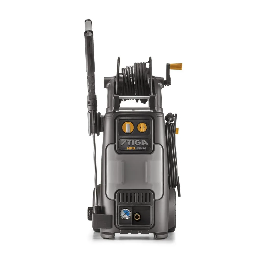 Der Stiga HPS 650 RG ist mit seinen 150 Bar der perfekte Kaltwasser-Hochdruckreiniger, um selbst große Arbeitsbereiche zu reinigen. Der zusätzliche Handgriff sorgt dabei für einen verbesserten Bedienkomfort. Durch seine großen Gummi-Räder und den Teleskopgriff mit Soft-Touch ist der stabile Reiniger leicht zu transportieren und sehr beweglich. Der Stiga HPS 650 RG ist mit einer Schlauchtrommel und einem Zubehörfach ausgestattet und eignet sich ideal zur Reinigung schwer verunreinigter Gartenmaschinen, Werkzeuge, Gärten, Terrassen, Treppen, Fahrräder, Motorräder, Autos, Wege, Zufahrten, Holzelemente, Bungalowfassaden und vielem mehr.